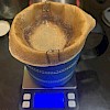 When I’m at home I use a gooseneck kettle with a thermometer and a scale to carefully portion out my pours into roughly 10 second durations of about 50 grams of water until I reach 300 grams.