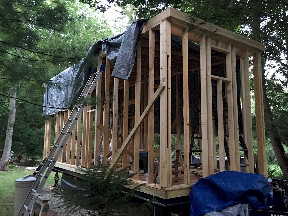 As MY Dad said to me once that HIS father had said to HIM, “You showed a lot more sense getting out of that problem than you did getting into it!” I pass that on now to Michael, but with the disclaimer that the rain was more than we have seen in a very long time, and he had taken reasonable precautions to keep the rainwater from collecting into growing puddles. It just came down too fast and too hard. Also, the full extent of his foresight in planning minute details of the project is only just now beginning to become clear as the whole family watches him putting up sections of exterior wall sheathing.