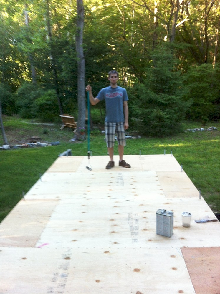 A single thin coat of Thompson’s Water Seal was applied to the completed subfloor to keep it from absorbing any water while exposed to the elements (though we are doing our best to keep everything under tarps anyway).