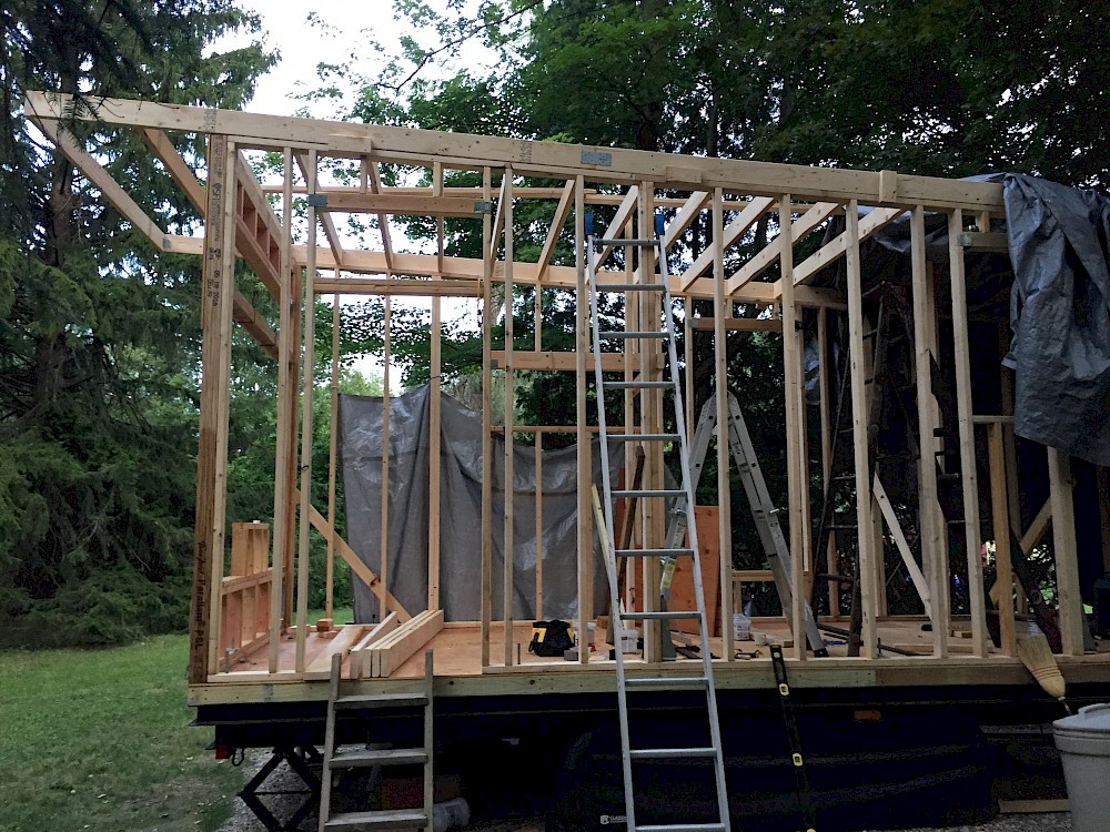 Michael also assembled the 38” roof overhang that is now above the wall-to-wall picture window opening in the main living area. To provide for this cantilevered feature, he first put it together resting entirely on the top plates above the main living area. It includes two ten-foot 2x6es lying on the top side plates and two 2x6 rafters perpendicular to them.