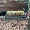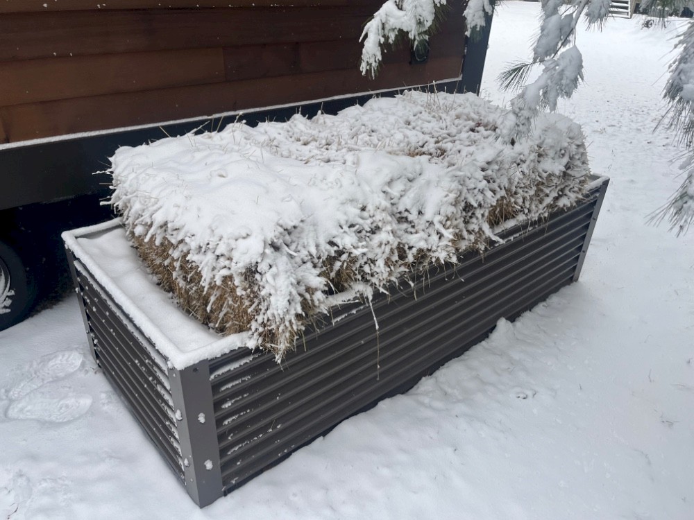 Once the ferns went dormant for the winter, I purchased some hay bales from a local farm and stacked them on top of the basin for insulation, my hope being that the bales would provide enough R-value to keep the core of the basin from freezing and to continue functioning over the winter (over the summer I will repurpose these bales as compost cover material). Before adding the bales, I topped off the basin with some fresh mulch since it had compacted down a few inches over the summer. I also added a few inches of fresh mulch to the bottom of the mulch shield.
